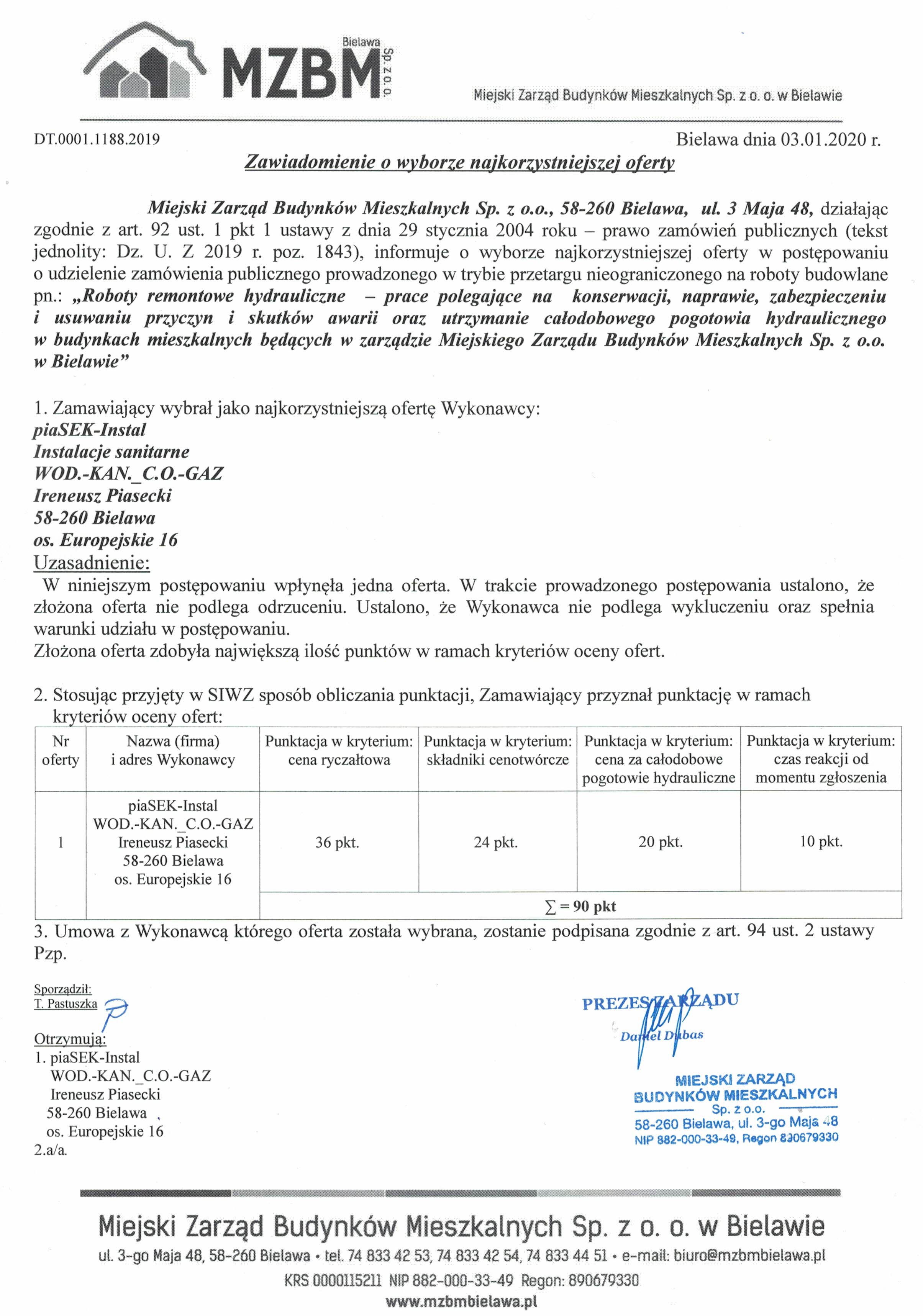 "Roboty remontowe hydrauliczne - prace polegające na konserwacji, naprawie, zabezpieczeniu i usuwaniu przyczyn i skutków awarii oraz utrzymanie całodobowego pogotowia hydraulicznego w budynkach mieszkalnych będących w zarządzie Miejskiego Zarządu Budynków Mieszkalnych Sp. z o.o. w Bielawie"